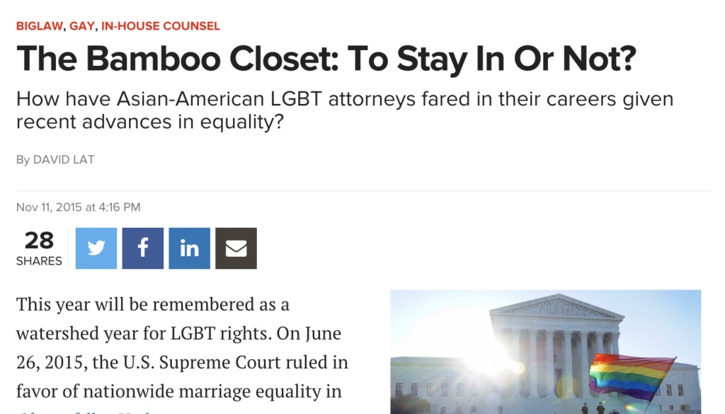 David Lat, Above the Law. The Bamboo Closet: To Stay in Or Not? November 11, 2015.